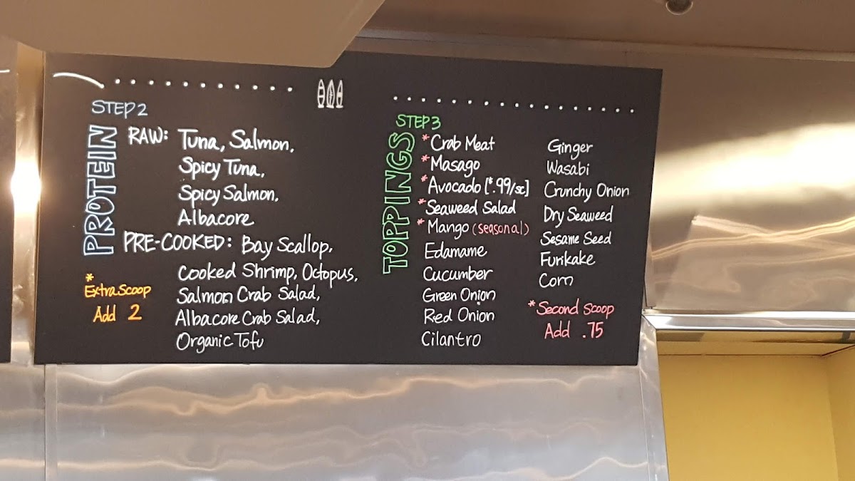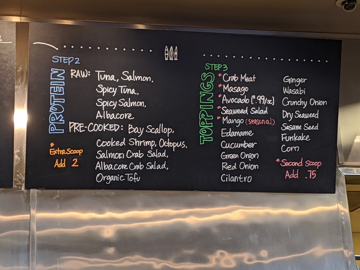 Raw: Tuna, Salmon, Spicy Tuna, Spicy Salmon, Albacore. Pre-Cooked: Bay Scallop, Cooked Shrimp, Octopus, Salmon Crab Salad, Albacore Crab Salad, Organic Tofu. Extra scoop Add 1.50